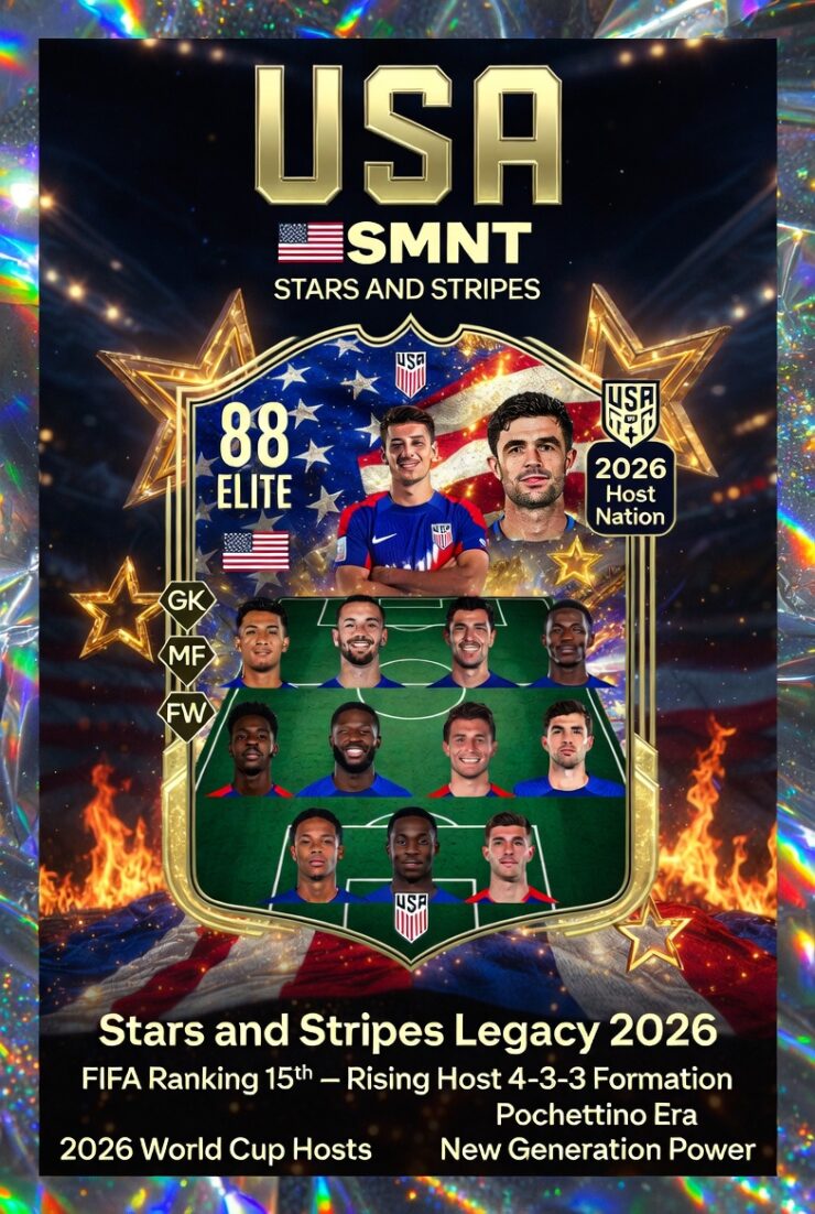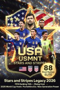 アメリカ代表(USA / USMNT)の紹介ページを作ったよ!テーマ「2026 W杯開催国として上昇」に合わせて、自動出場権を得たホームアドバンテージを活かし、FIFAランキング15位前後(2026年1月時点)まで上昇。Mauricio Pochettino(マウリシオ・ポチェッティーノ)監督のもと、若手タレントと欧州組の融合が進む「新世代の勢い」が魅力のチームです。以下はこれまでのベルギー・モロッコ・クロアチア・セネガル・イタリア版と同じフォーマットで統一。選手名にはカタカナをしっかり添えた(2026年3月現在の最新傾向に基づく)。基本情報