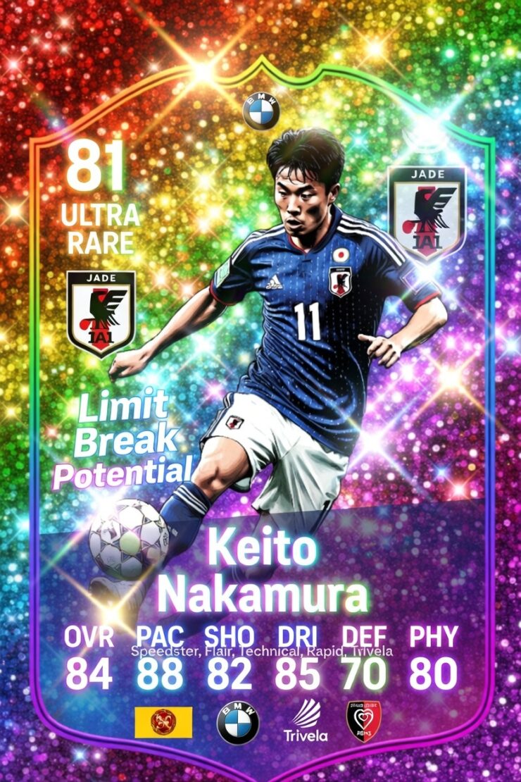 トレイト:Speedster, Flair, Technical, Rapid, Trivela これで中村敬斗の「左WGのライバル」を体現したカードになったよ! キラキラ輝く背景にスタッド・ランスロゴ、日本代表エンブレム、BMW風の高級感エフェクト入り。