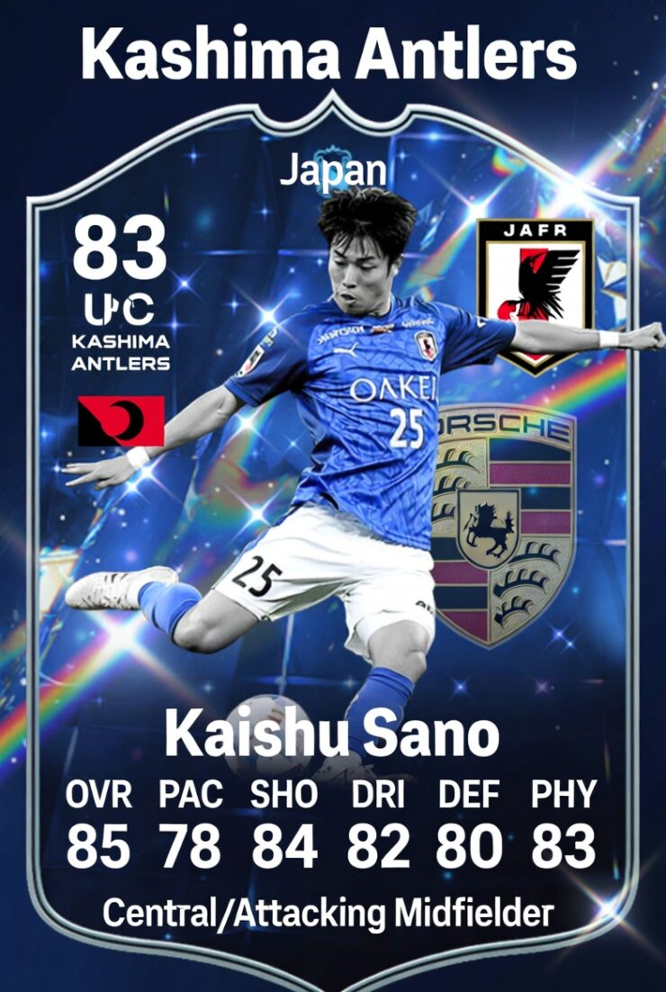 トレイト:Engine, Playmaker, Long Passer, Relentless, Solid Player これで佐野海舟の「新戦力として注目」を体現したカードになったよ! キラキラ輝く背景に鹿島アントラーズロゴ、日本代表エンブレム、Porsche風の高級感エフェクト入り。